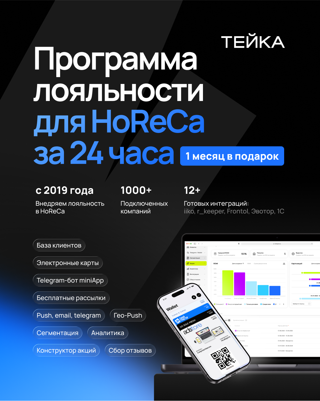 Тейка - сервис для создания программы лояльности, который объединяет инструменты для работы с клиентской базой и автоматизирует маркетинговые процессы, повышая лояльность гостей, повторные визиты и средний чек.